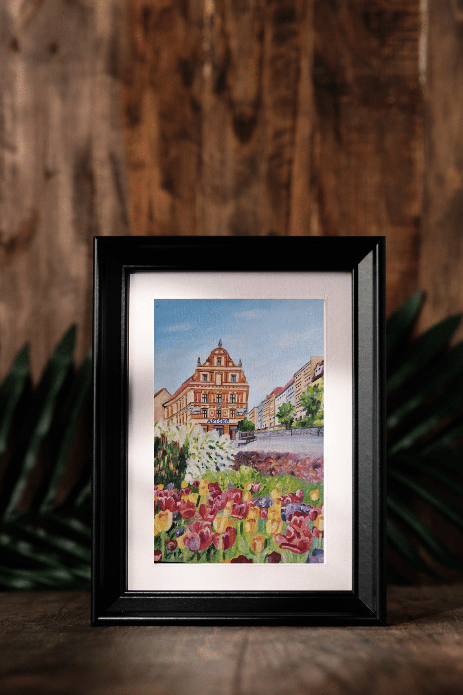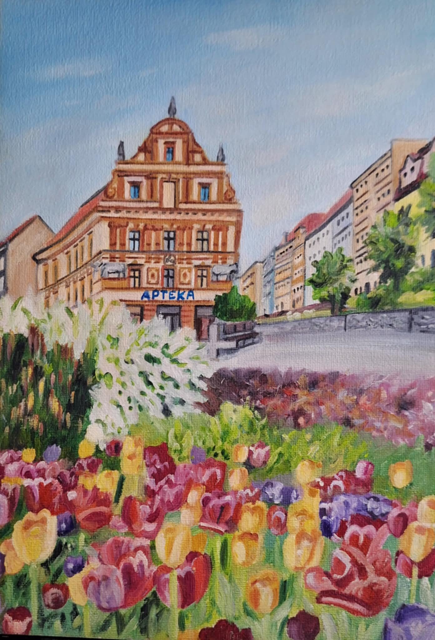 Bezpośredni widok ulicy w Świdnicy, z historyczną kamienicą apteki w centrum kompozycji. Na pierwszym planie rozkwita pole wielobarwnych tulipanów — w odcieniach czerwieni, żółci i fioletu — które ożywiają miejską scenerię. Obraz łączy precyzyjnie uchwyconą architekturę z radosnym rytmem kolorów natury. Każdy obraz to ręcznie malowany, oryginalny olej na płótnie o wymiarach 18×24 cm. Każde dzieło jest unikalne, powstałe z indywidualnym podejściem i dbałością o szczegóły — nie są to wydruki ani reprodukcje.